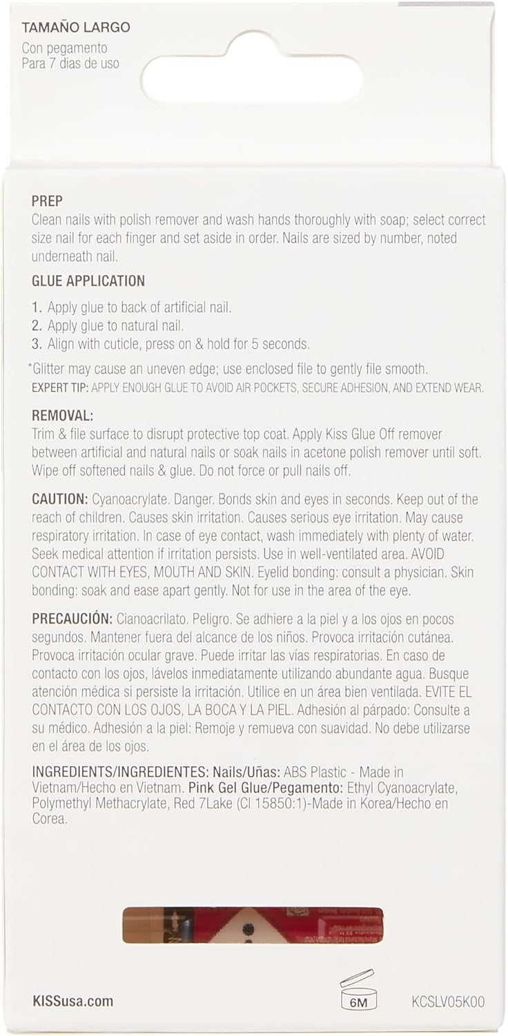PREP: Clean nails with nail polish remover and wash hands thoroughly with soap; select correct size nail for each finger and set aside in order. Nails are sized by number, noted underneath nail. • GLUE: Apply glue to back of artificial nail. Apply glue to natural nail. Align with cuticle, gently press on & hold for 5 seconds. EXPERT TIP: Apply enough glue to avoid air pockets, secure adhesion, and extend wear. REMOVAL: Trim & file surface to disrupt protective top coat. Soak nails in acetone polish remover until soft. Wipe off softened nails & glue. Do not force or pull nails off. • For glitter nails: Glitter may cause an uneven edge; use enclosed file to gently file smooth.