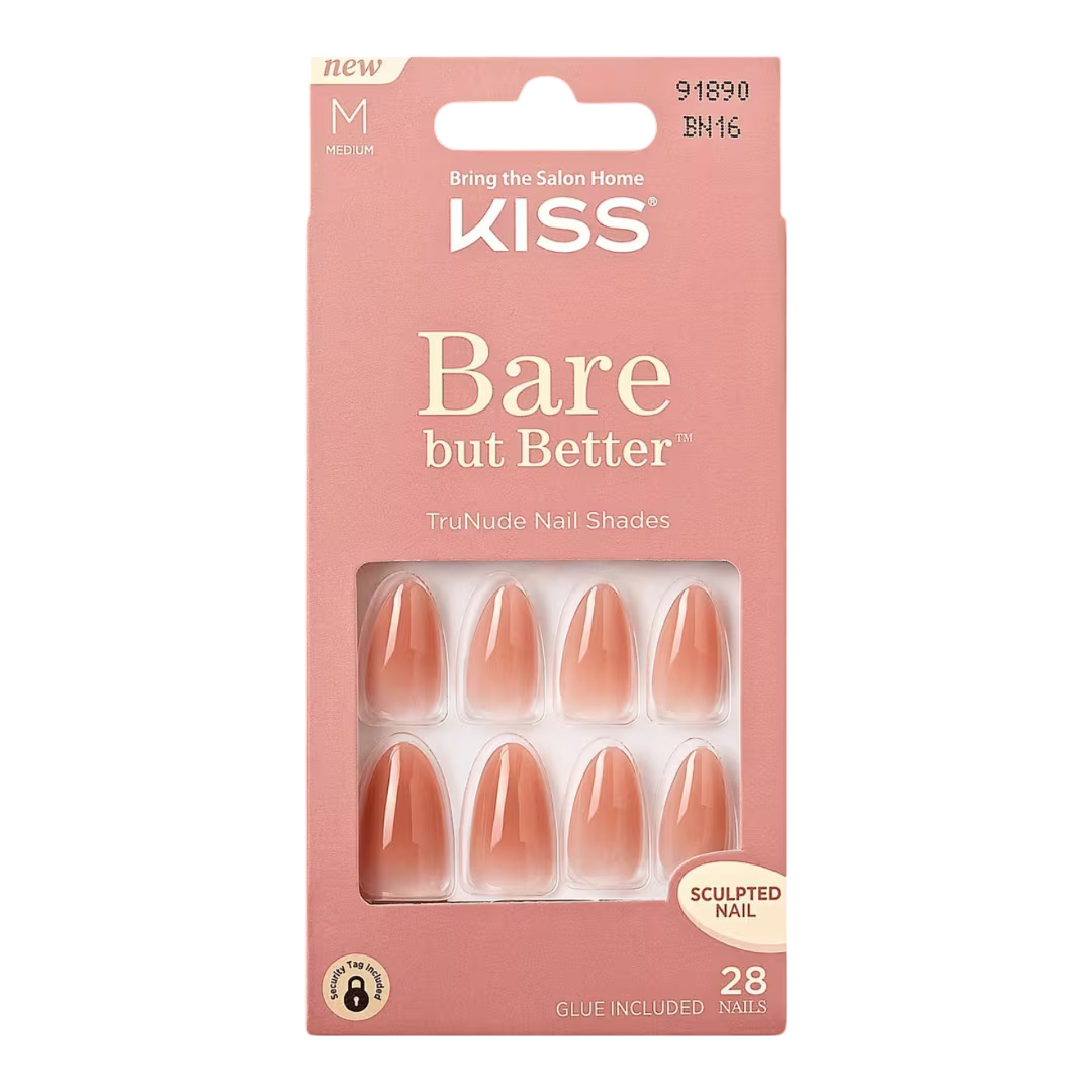KISS Bare but Better Nails को लगाना और हटाना आसान है, ये वाटरप्रूफ हैं, 7 दिनों तक टिकते हैं, इनमें 28 नाखून, जेल ग्लू, एक मिनी फाइल और एक मैनीक्योर स्टिक शामिल हैं।